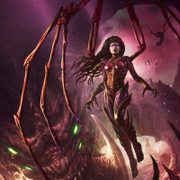 The image depicts a character from the video game "StarCraft" named Kerrigan. She is shown with a dramatic pose, seemingly in battle or confrontation with another creature that has a demonic appearance and large horns.