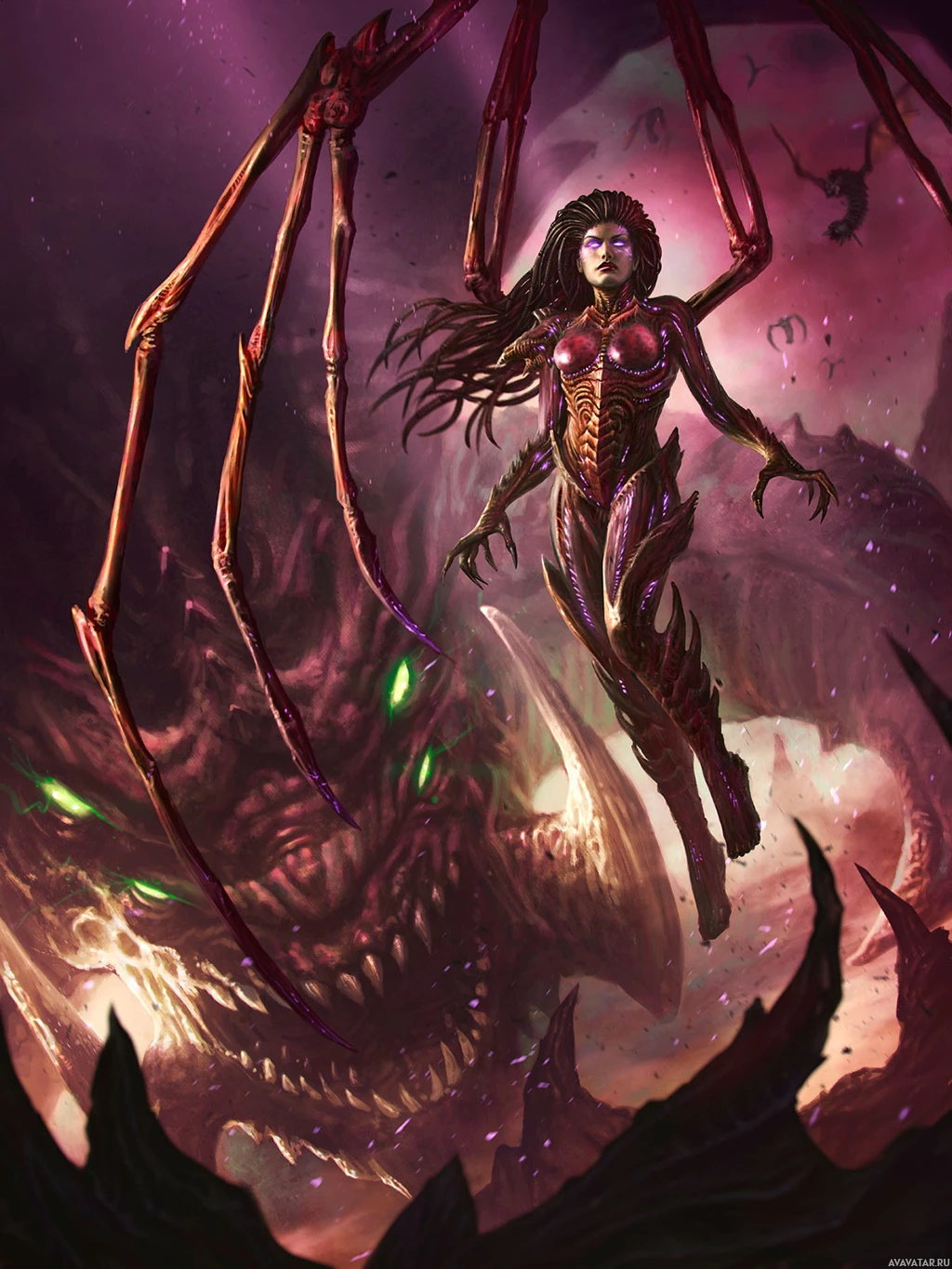 На картинке изображен персонаж из видеоигры "StarCraft" по имени Керриган. Она изображена в драматической позе, по-видимому, в битве или противостоянии с другим существом, имеющим демоническую внешность и большие рога.