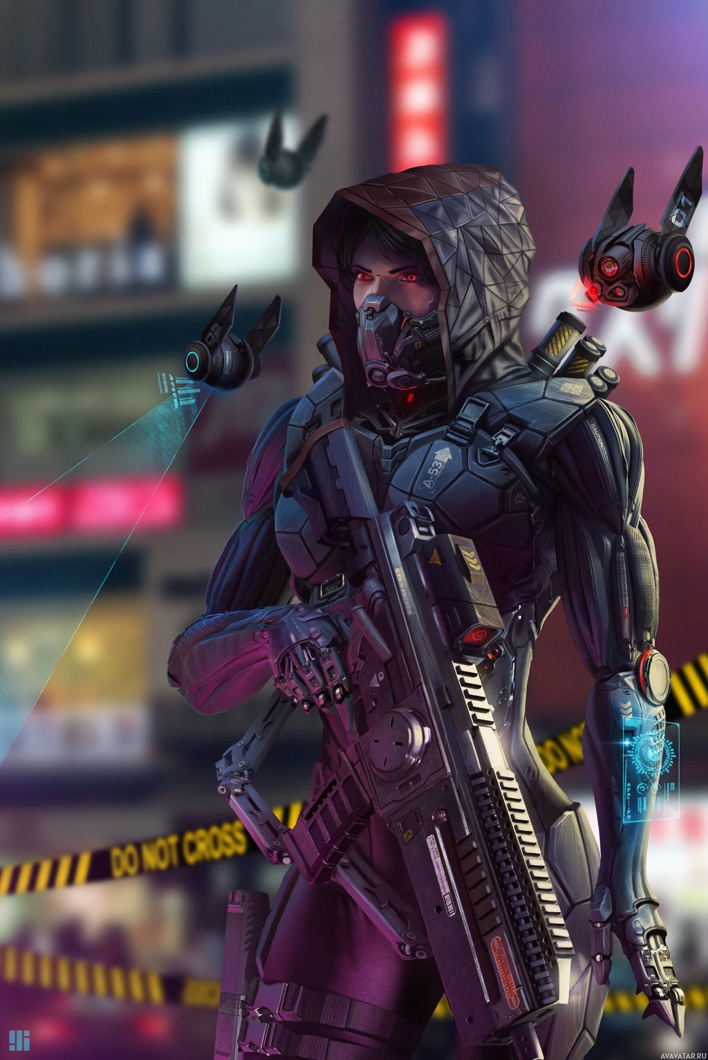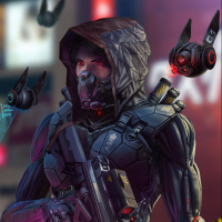 The image shows a character dressed in a futuristic, sci-fi