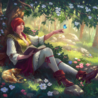 an expression of curiosity or contemplation. The environment around her is lush and green, featuring elements such as trees, flowers, and a cat nearby. The image captures the character's relaxed posture and