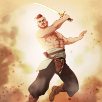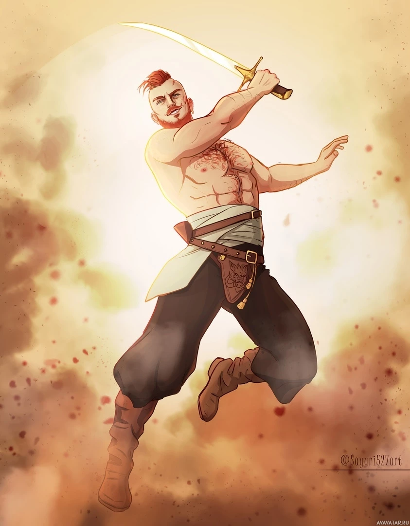 a red beard. The background suggests an intense battle or