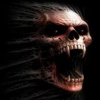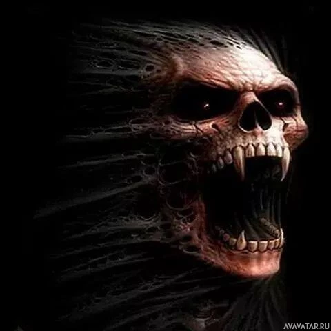 red eyes and sharp teeth, giving off a feeling of horror or fear. The background is dark and seems to be melting or eroding away from the skull, which adds to its threatening appearance.