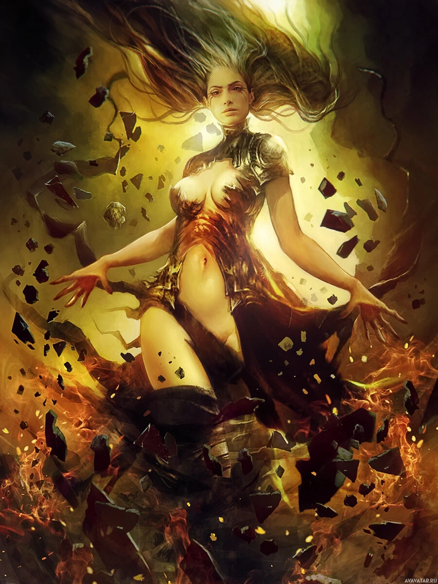 an impression of motion or chaos. Her pose suggests she might be engaged in battle or casting