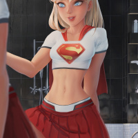 blonde hair and is wearing a red and white superhero costume with the word "SUPER" printed on it. There's also a stylized "S" emblem which resembles the Supergirl logo, suggesting that she might be portrayed as a version of Supergirl from