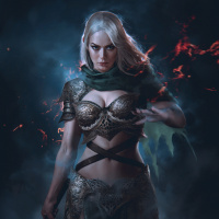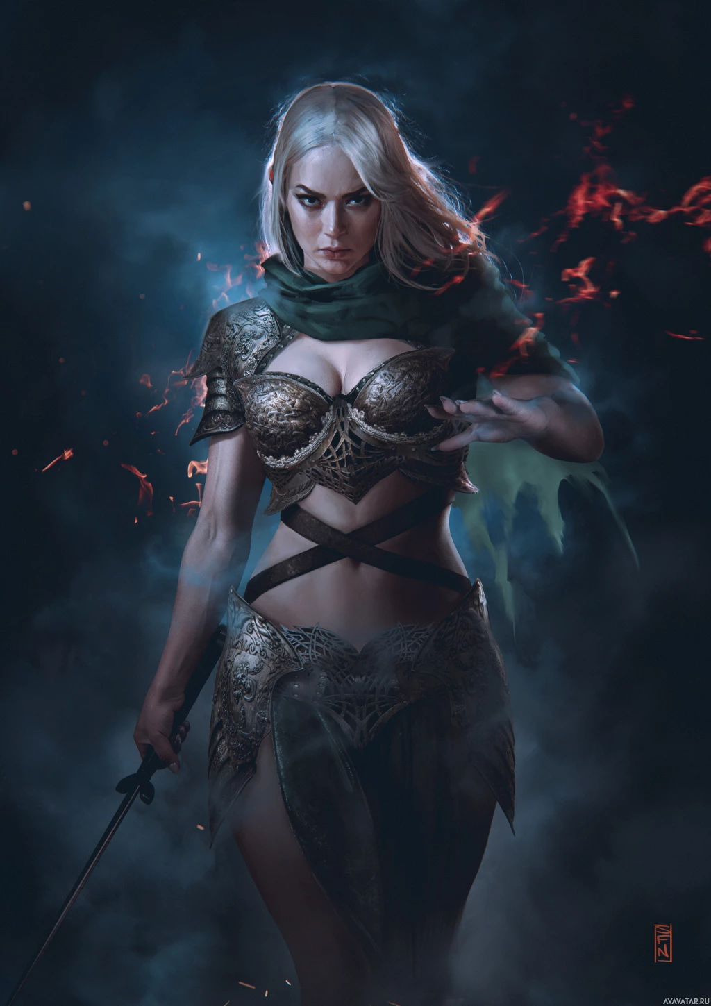 На этом снимке изображен персонаж женского пола, одетый в доспехи воина, с белыми волосами. В руках у нее что-то похожее на меч, а на лице - решительное выражение, на драматическом фоне, который наводит на мысль о битве или приключении. Общая тематика изображения навеяна фантазиями, возможно, из видеоигр или фэнтезийных произведений искусства.