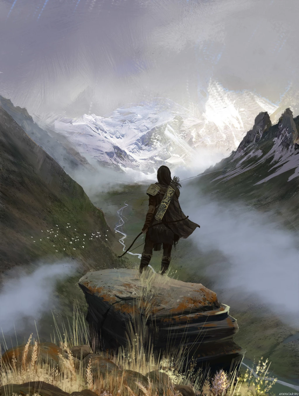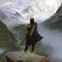 a rocky outcropping in what appears to be a mountainous region. The individual has a bow and arrow, suggesting that they might be a hunter or an archer. They are looking into the distance, possibly observing their surroundings or waiting for something. The landscape around them is rugged and snow-covered, hinting at