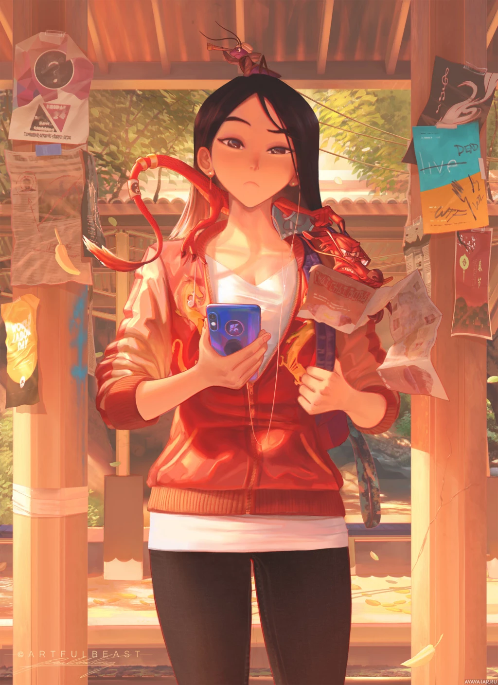 brunette hair and is holding what appears to be a smartphone in one hand and some sort of object resembling a small creature or a plushie in the other. She seems to be looking at something off-frame with