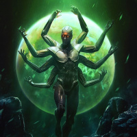 celestial body, greenish glows, and what appears to be an alien landscape.