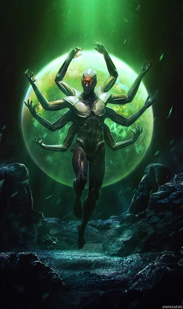 a fantastical pose. The person appears to be a fusion of human and robotic elements, with multiple arms raised as if performing a yoga or