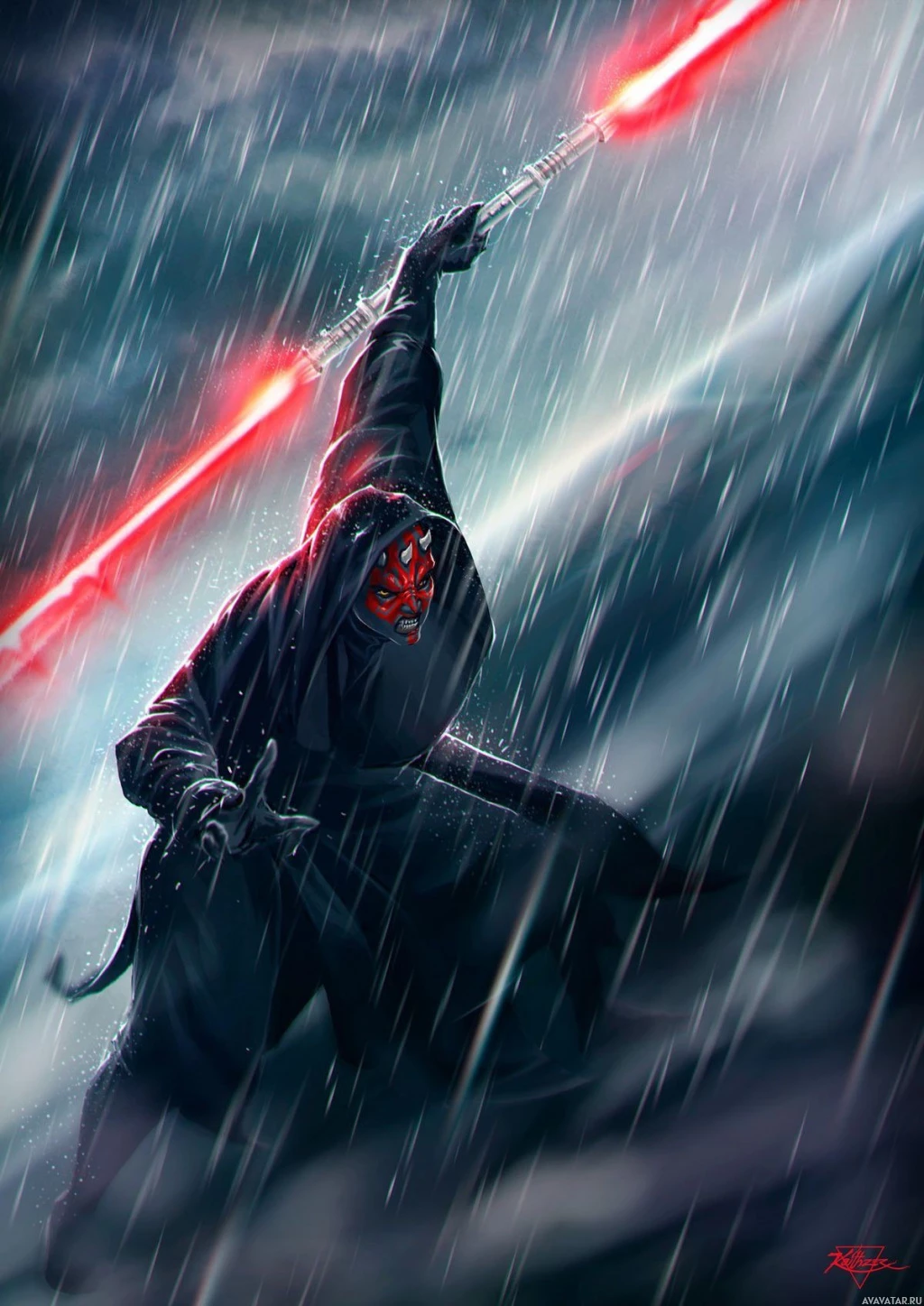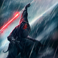 red lightsaber and black robe, which are characteristic of his appearance from the films. The setting appears to be dark and stormy, with rain falling around him, adding a dramatic and intense atmosphere to the scene.