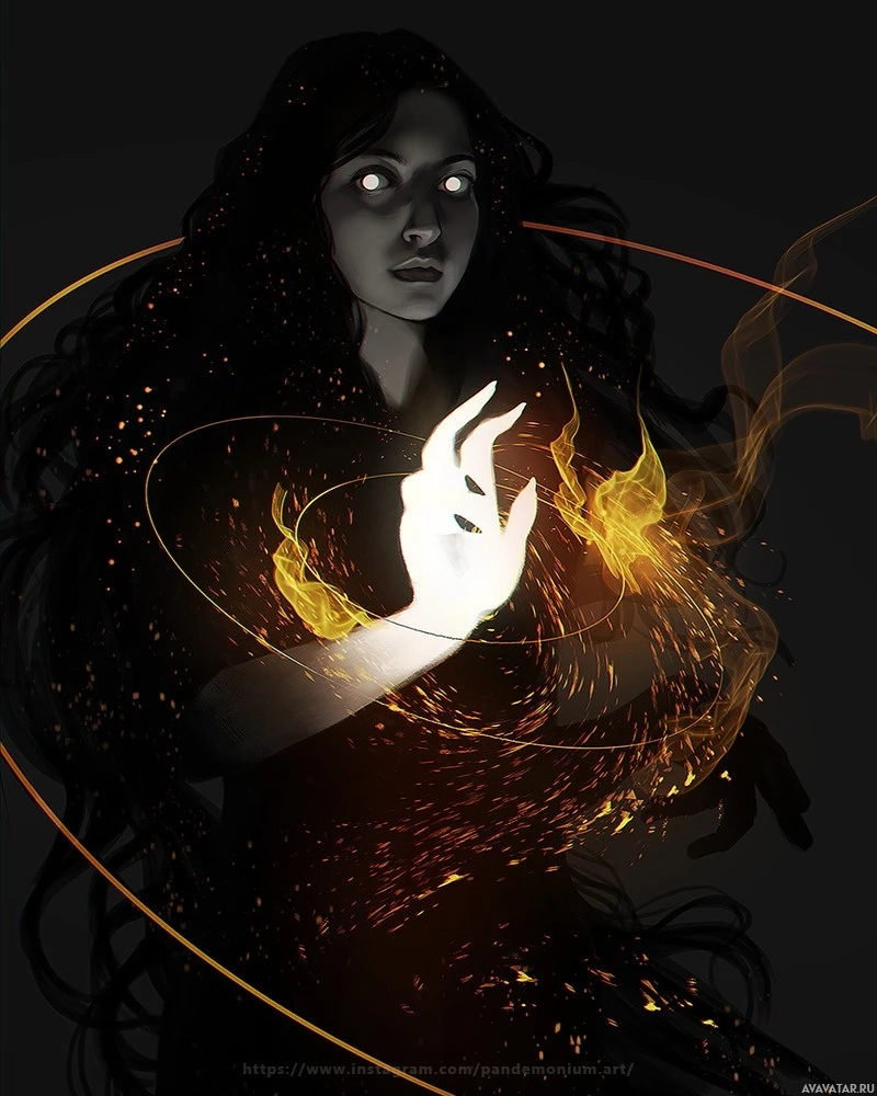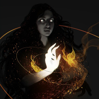 magical energy or fire from her hand. This energy appears to be creating patterns around her, which could suggest a fantasy or magic theme. There are also some circular shapes and possibly flames, adding to