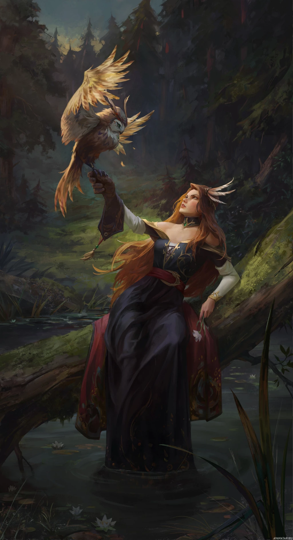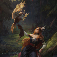 На картинке изображена фантастическая сцена с женским персонажем, который выглядит как эльф или фея. Она держит в руке сову и окружена естественной лесной обстановкой с деревьями и травой. Ее наряд наводит на мысль, что она, возможно, обладает какими-то магическими способностями или родом из фантастического мира. Работа передает ощущение очарования и может быть связана с историями или сказками, в которых участвуют мифические существа и персонажи.