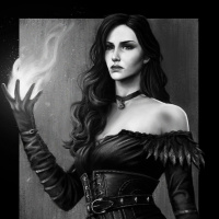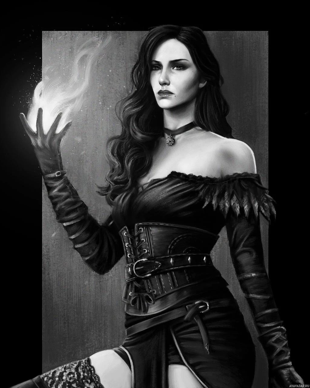 The image depicts an illustrated character that appears to be Yennefer from the "The Witcher" series, which is a popular