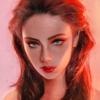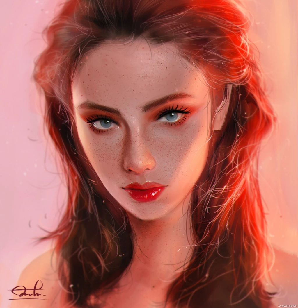 red hair and striking blue eyes, which give her an elegant and somewhat mystical appearance. The character is depicted with subtle details that suggest she may have freckles on her face, adding to her