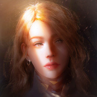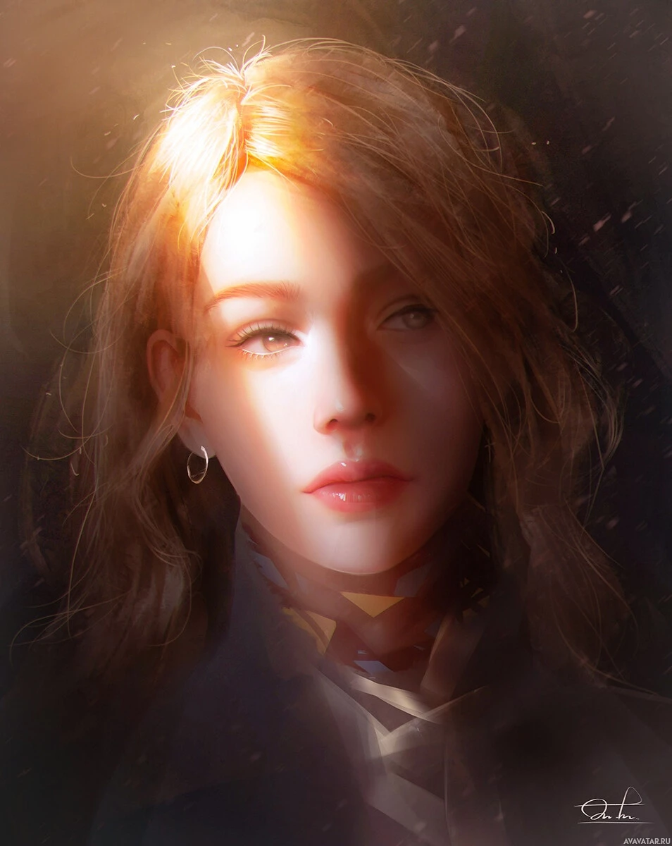 The image shows a portrait of a young woman with blonde hair. She has a neutral expression and appears to be looking directly at the viewer. The artwork has a layered effect, creating a sense of depth in her features.