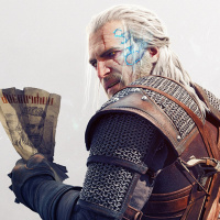 The image features a character known as Geralt of Rivia from the video game "The Witcher 3: Wild Hunt." He is depicted in his signature armor and holding a letter.