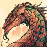 intricate scales and patterns, with colors ranging from earthy browns to vibrant reds and greens. The dragon is shown in profile, showcasing its long snout,