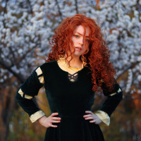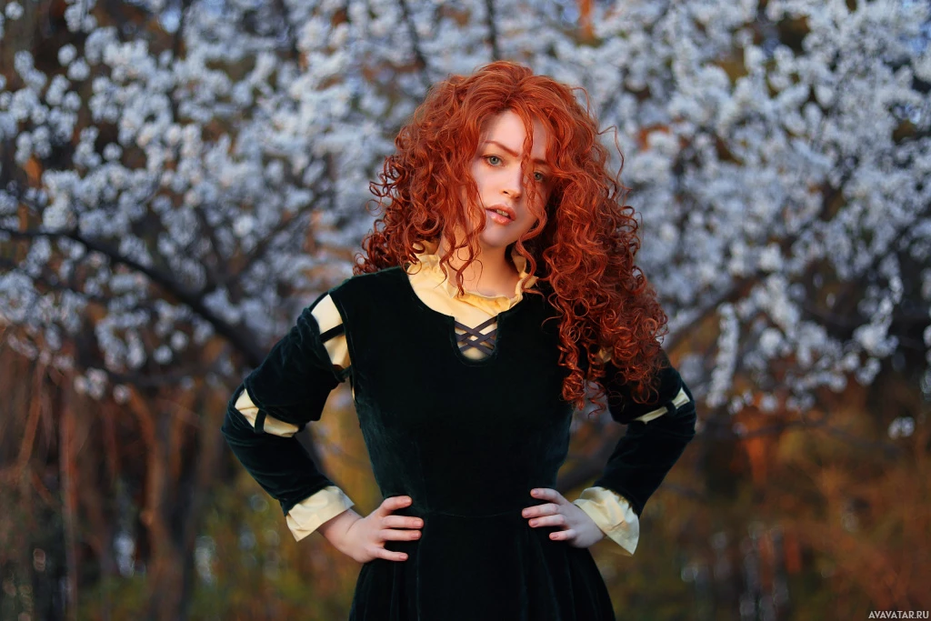 red hair style. She is wearing what appears to be a costume resembling Merida, the character from