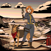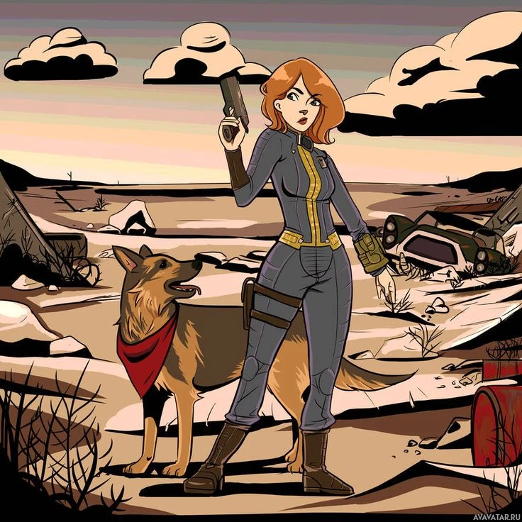 a video game setting. She is dressed in a blue and gray jumpsuit that seems inspired by the outfits commonly seen in games like "Fallout." The woman is holding a weapon and stands confidently, looking towards her right. To her left stands a dog, which could potentially be a character or companion from the same