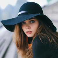 На картинке изображена молодая женщина, сидящая на чем-то, похожем на скамейку или трибуну. На ней черная шляпа, а взгляд устремлен в сторону, придавая лицу задумчивое выражение. Ее наряд состоит из повседневной одежды, в которой сочетаются темные и нейтральные тона.