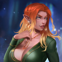 red hair. She is wearing an outfit that appears to be inspired by fantasy or medieval style, featuring a green