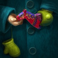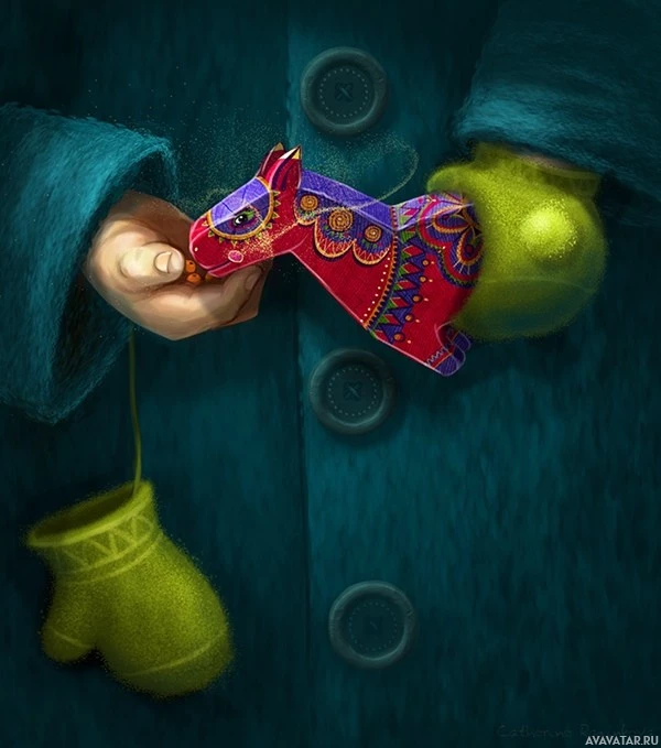 the bright colors of the horse toy. The image has a fantastical or whimsical quality, as suggested by the surreal elements such as the hand seemingly floating in front of the body and