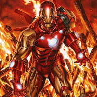 Iron Man is standing amidst fiery flames, which could be part of a scene where he has been caught in a blaze or is using his suit's technology to combat fires. The character is facing forward and appears to be ready for action.