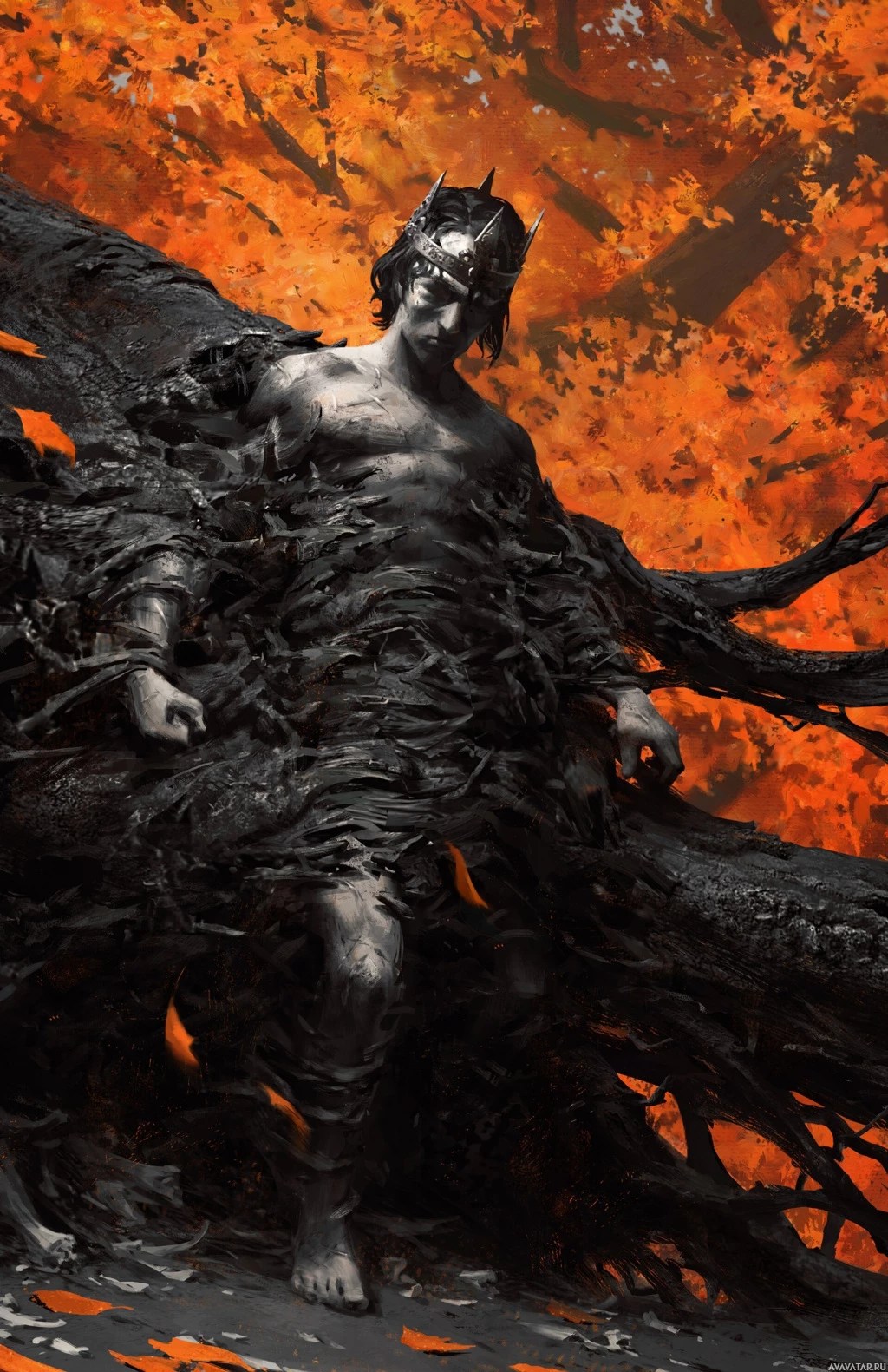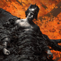 a male character. He is adorned with a crown, suggesting a royal or regal status. His attire is dark and seems to have an ominous tone, possibly indicating he may be a villain or a dark