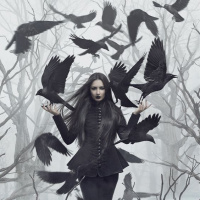 The image features a woman standing amidst a forest setting, surrounded by crows. She appears to be in control of the situation with a composed posture, despite the numerous birds around her. The atmosphere is mystical and could suggest a scene from a story or a conceptual artwork.