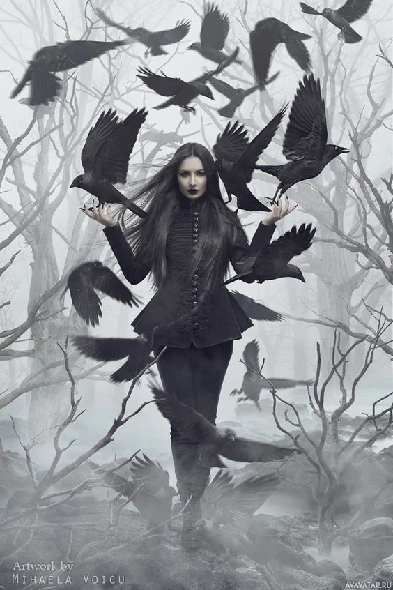 На картинке изображена женщина, стоящая посреди леса в окружении ворон. Кажется, что она держит ситуацию под контролем, несмотря на то, что вокруг нее множество птиц. Атмосфера мистическая и может напоминать сцену из рассказа или концептуального произведения искусства.