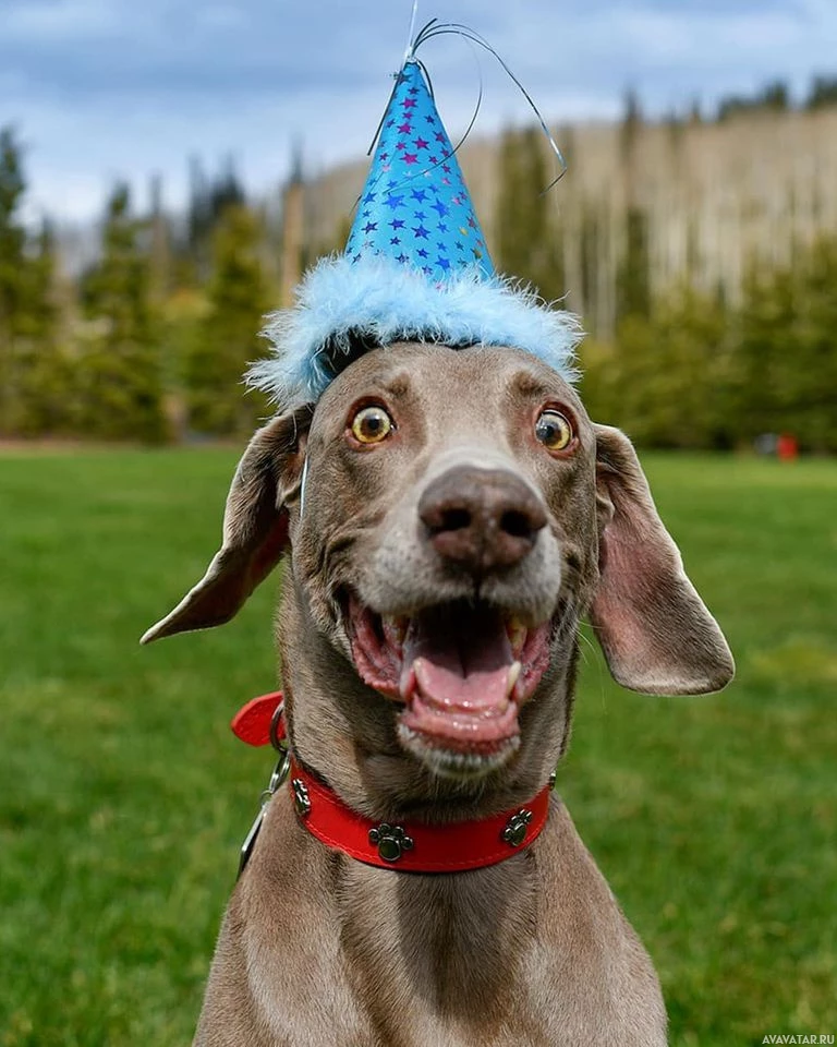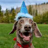 party hat. It appears to be an older dog breed, possibly a Weimaraner or a similar breed with a grey coat and