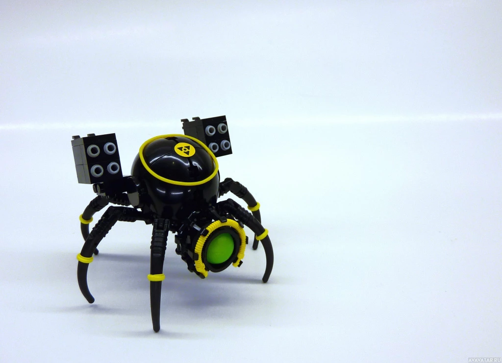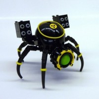 a Lego robot resembling a spider or a crab, with multiple legs and what appears to be eyes. It has a body that looks like it could have been designed as part of the Lego Robotics program, which is a line of educational robots for children. The design incorporates