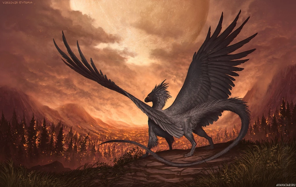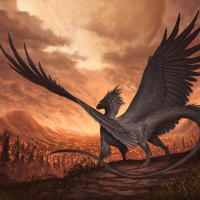 the body structure of a typical dragon but appears to be more of an avian variety, possibly resembling a griffin or some other mythical hybrid. It is set against a dramatic backdrop that includes a rising or setting sun, suggesting either dawn or dusk, with mountains in the distance and what seems to be fire in the sky, adding to