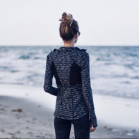 The picture shows a woman from behind, standing on a beach next to the sea. She is wearing a black and gray swimsuit and has her hair up in a bun. The coastline extends into the horizon, suggesting an open view of the sea.
