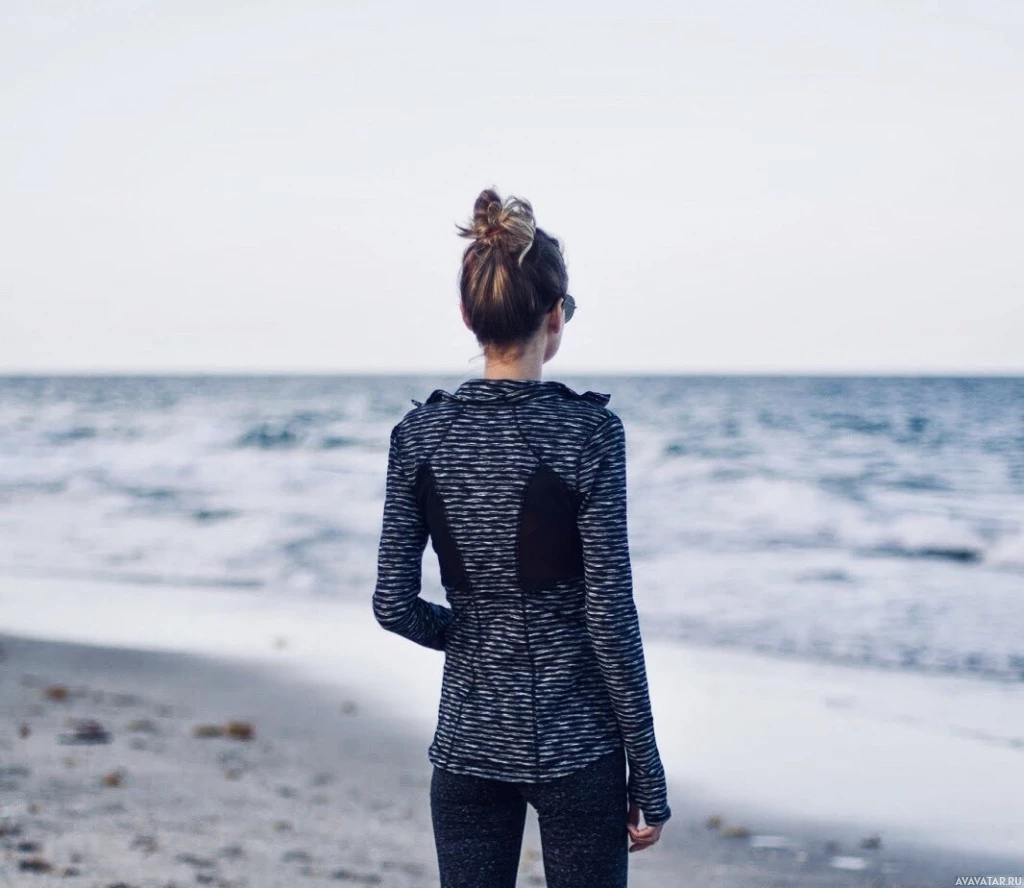 На картинке женщина изображена сзади, стоящей на пляже рядом с морем. На ней черно-серый купальник, а волосы собраны в пучок. Береговая линия простирается до горизонта, открывая вид на море.