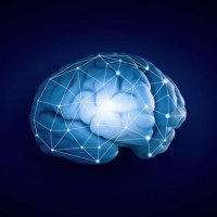 a dark background. A network or grid pattern overlays the surface of the brain, suggesting a connection or neural pathway. This design might be associated with concepts related to artificial intelligence, neuroscience, or computer graphics.