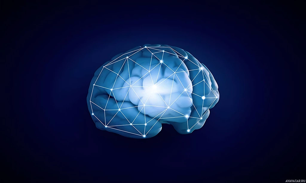 profile view. The brain is highlighted by vibrant blue and white colors against