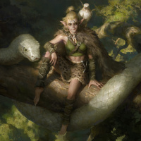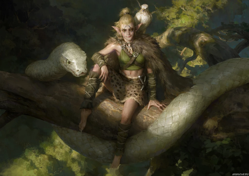 a fur garment over their body and have accessories that suggest a wilderness or natural theme. The image has been edited to enhance its fantasy elements, giving it an almost ethereal quality with the blending of human and snake forms.