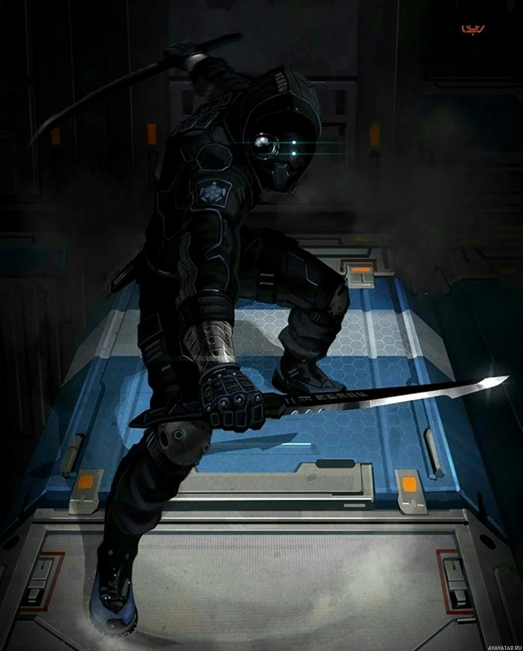 ninja swords, known as katanas. The character is crouching in