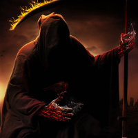 red eyes, holding what looks like a scythe in one hand and a flaming skull in the other. This character is often associated with death and the supernatural in various