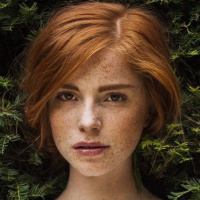 red hair. She has freckles on her face and is wearing