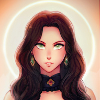 a fantasy world. The background includes what looks like a halo or aura around her head, suggesting a divine or powerful nature within the context of the image. The girl has a calm and serene expression on her face.