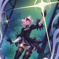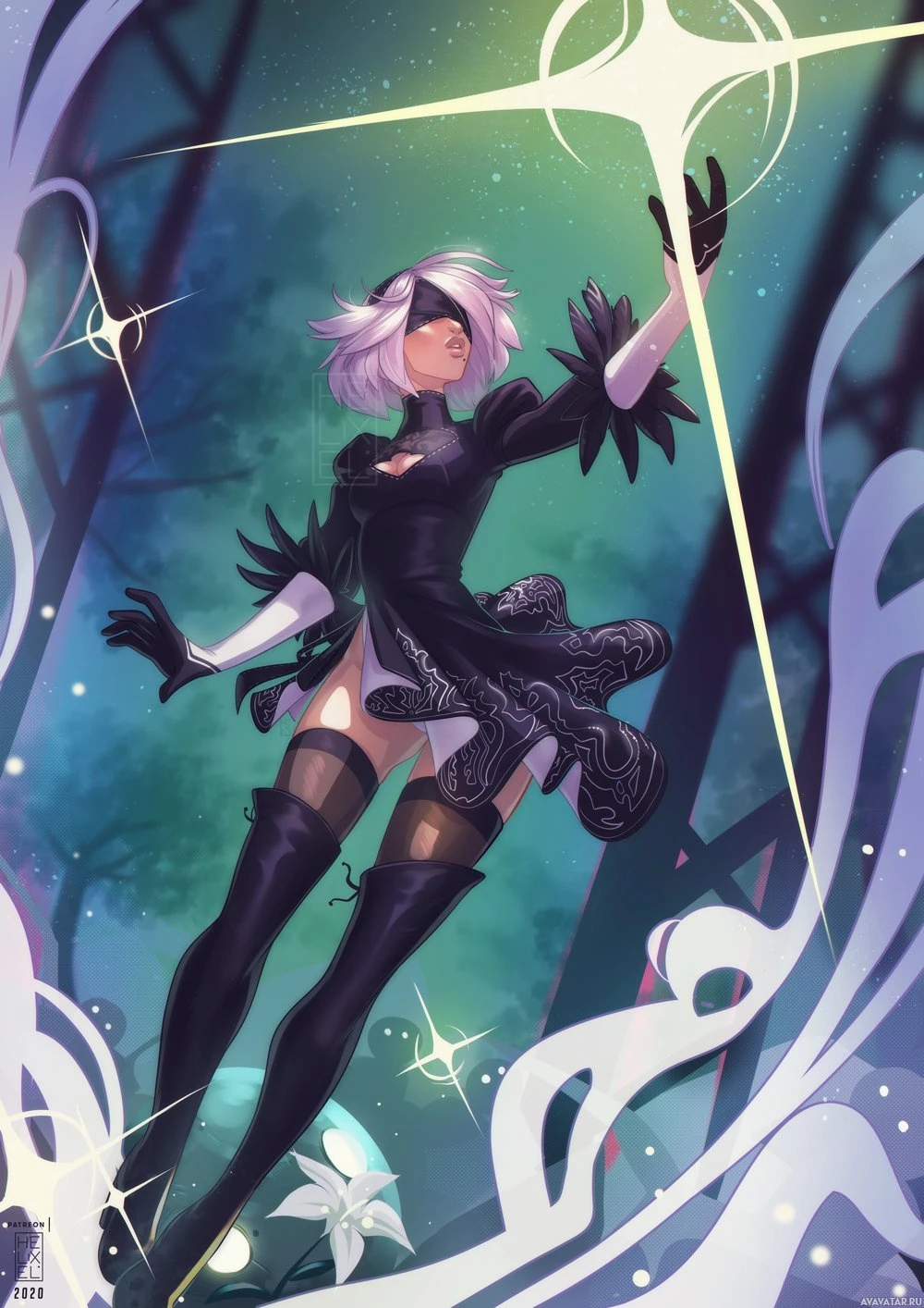 the video game "Nier: Automata." The character depicted appears to be a female android with black hair and