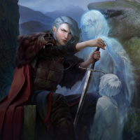 На картинке изображена фантастическая сцена с персонажем, который, по-видимому, призывает призрака или взаимодействует с ним. Место действия похоже на туманную горную местность, что наводит на мысль о мистическом или сверхъестественном окружении. Персонаж держит посох и, похоже, сосредоточен на призраке.
