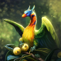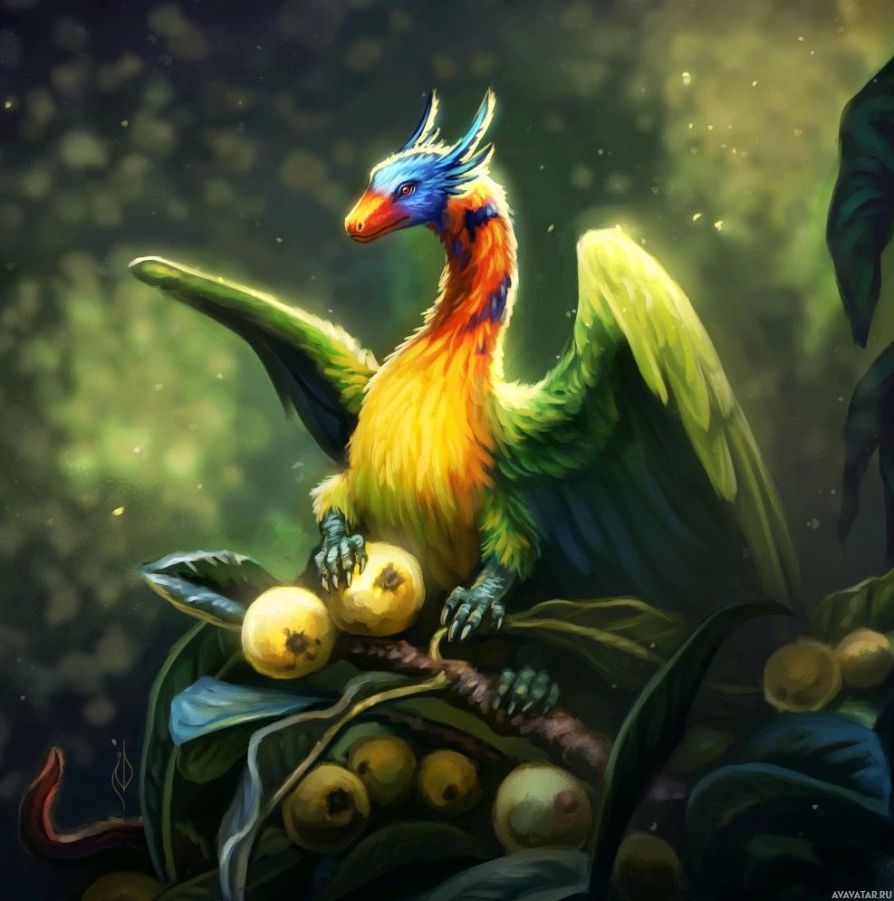the body structure of a bird, including wings and tail feathers, but also has elements that resemble a traditional dragon, such as a scaly texture on its body and head. The dragon is perched among leaves and appears to be sitting atop what looks like a pile of fruit or possibly eggs. The setting seems to be in a jungle or forested environment, with