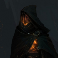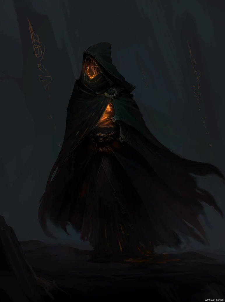 a video game or story. The character is wearing dark, hooded attire that could suggest they are