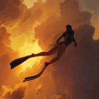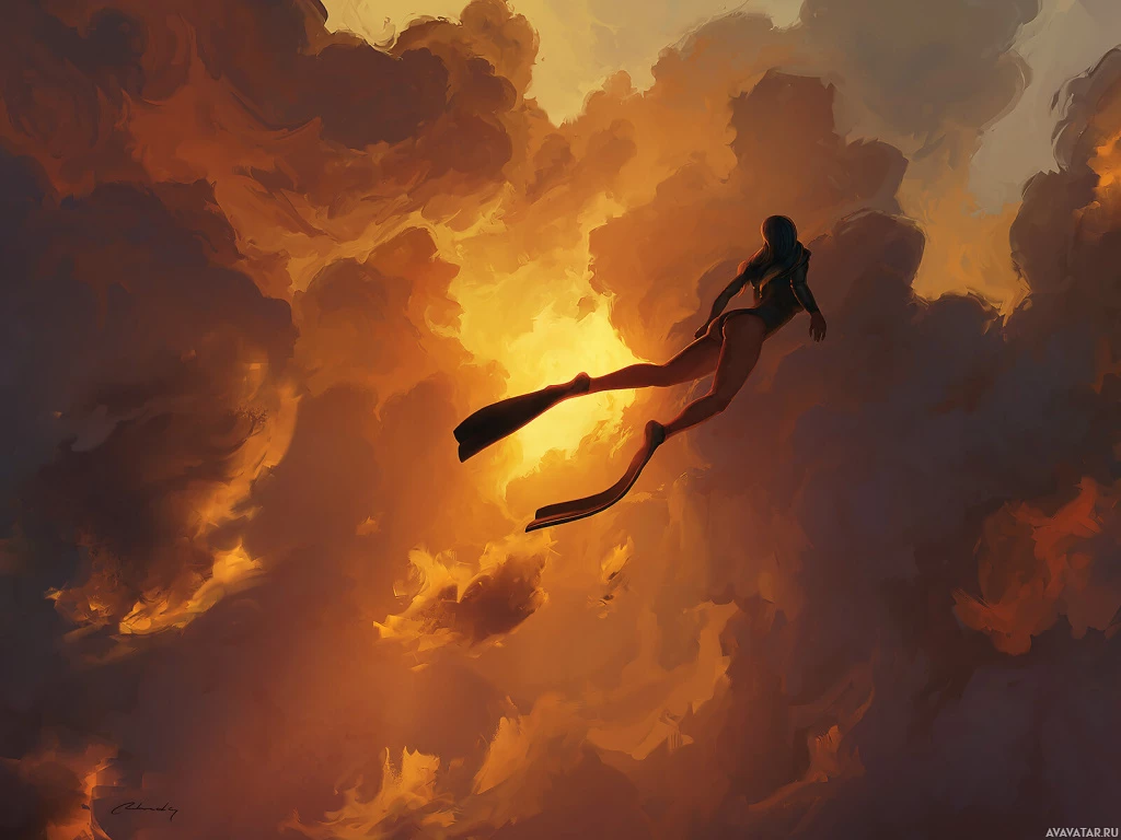 scuba gear, diving into what appears to be an explosion of vibrant clouds and sunlight. Her silhouette is outlined against the backdrop of
