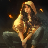 dark hair and is wearing a yellow hooded jacket. Her expression seems thoughtful or contemplative as she gazes off to the side. There are small flames or sparks around her, suggesting that the setting might be at night or in a moody,