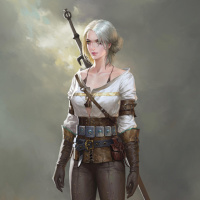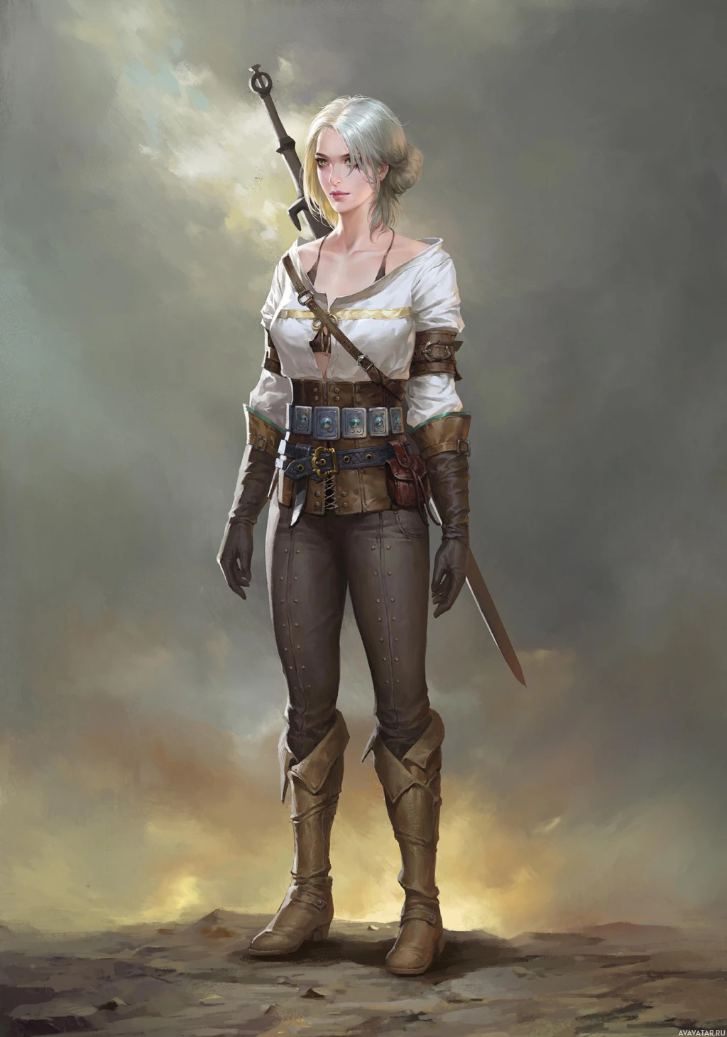 the video game "The Witcher 3: Wild Hunt." This character is known as Ciri. She is portrayed standing upright with a confident and determined posture, holding a sword in her right hand. The background has an overcast sky with