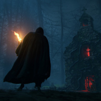a video game that appears to be set in a dark, foggy forest. There is an individual wearing a long cloak and holding a torch, which illuminates